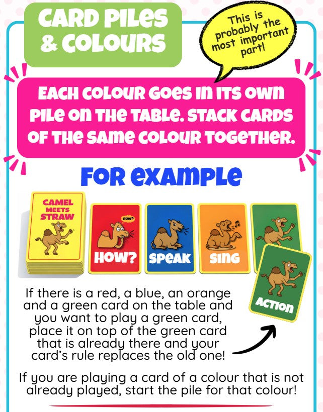 Each Straw (non-performing player) takes their turn to play one card. They put it down next to or on top of the active card(s) in the middle. Each new card adds a new layer to the Camel’s challenge!
