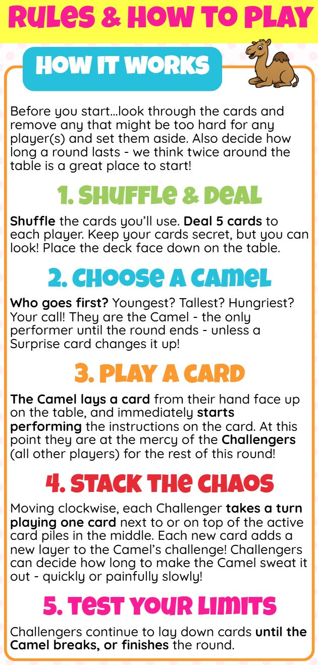 The Camel (AKA the performer) plays a card from their hand face up in the middle of the table, and immediately starts performing the instructions on the card. For the rest of the round, the Camel is at the mercy of the other players (AKA The Straw!).